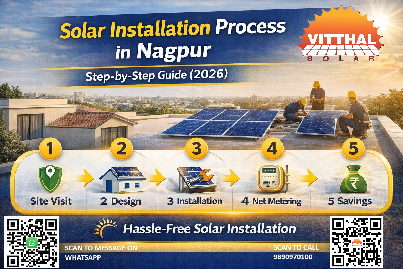 π§ Rooftop Solar Installation Process in Nagpur β Step-by-Step Guide (2026) Planning to install rooftop solar in Nagpur but donβt know how the process works? π Good news: Itβs simpler than you think β if you choose the right company. This guide explains the complete solar installation process, so you know exactly what to expect. β‘ Step 1: Site Visit & Solar Assessment The process starts with a free site visit. Experts check: Roof size & direction Shadow analysis Electricity bill Structure strength π This helps decide the perfect system size (3kW, 5kW, etc.) π Step 2: System Design & Proposal Based on your site: β System capacity is finalized β Panel layout is designed β Cost + subsidy breakdown shared π You get full clarity before investing. π Step 3: Documentation & Subsidy Process This is where most people get confused β but a good company handles it. Includes: Government subsidy application MSEDCL approvals Net metering application π No need to run to offices. π© Step 4: Solar Panel Installation Now the actual work begins. β Mounting structure installed β Solar panels fixed β Inverter connected β Wiring & safety checks β± Time required: 2β5 days π Step 5: Net Meter Installation After installation: MSEDCL installs net meter System gets grid-connected π You can now: Use solar power Export extra electricity β‘ Step 6: System Activation & Testing Before final handover: β System tested β Generation checked β App monitoring setup π You can track daily electricity generation. π° Step 7: Start Saving Money Now the best part: π Your electricity bill drops by 70β90% β³ Total Time for Installation in Nagpur Step Time Site visit 1 day Design & approval 3β7 days Installation 2β5 days Net metering 7β15 days π Total: 2β3 weeks (approx.) β οΈ Common Problems (If You Choose Wrong Vendor) β Delayed approvals β Poor installation β No subsidy support β No after-sales service π Why Vitthal Solar Offers Hassle-Free Installation β Complete end-to-end service β Local Nagpur team β Fast MSEDCL processing β Professional installation β Ongoing support π You donβt have to worry about anything. π‘ Pro Tip π Always choose a company that handles everything from start to finish π Ready to Go Solar? Donβt delay β subsidy benefits may reduce in future. β‘ Book Your FREE Site Visit Today π² Contact Vitthal Solar, Nagpur π Free consultation π Get complete cost + savings report β³ Limited subsidy slots Ready to stop renting your power and start owning it? Let our experts conduct a free site survey and show you exactly how much you can save. βπ Call / WhatsApp us today: 9890970100 π Vitthal Solar β Proudly Serving Nagpur & Surrounding Areas Rooftop Solar Nagpur βSolar Panel Price in Nagpur βPM Surya Ghar Yojana Nagpur βSolar Subsidy Maharashtra 2026 βBest Solar Company in Nagpur βSolar Installation Nagpur βHow to apply for PM Surya Ghar subsidy in Nagpur βMSEDCL solar net metering rules 2026 βMSEDCL 12-month average consumption solar cap βReduce electricity bill in Nagpur summer βSolar for EV charging at home Nagpur βSolar capacity approval hurdles MSEDCL βTopCon Solar Panels Nagpur βBifacial Solar Panels for high heat βOn-grid solar system Nagpur βSolar inverter capacity for home βMNRE approved solar vendors Nagpur Tired of high MSEDCL bills? Switch to Rooftop Solar in Nagpur with Vitthal Solar. Learn how to beat the 12-month consumption cap and claim your PM Surya Ghar subsidy. Call 9890970100 for a free survey.